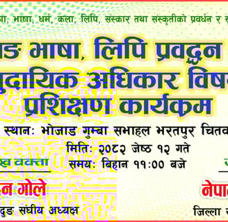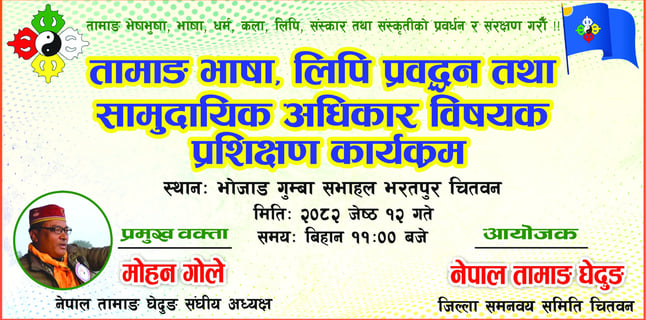 नेपाल तामाङ घेदुङ जिल्ला समन्वय समिति चितवनको आयोजनामा भाषा, लिपी प्रबर्द्धन तथा सामुदायिक अधिकार बिषयक प्रशिक्षण कार्यक्रम चितवनको भरतपुर महानगरपालिका -११ भोजाडमा सम्पन्न गरियो ।